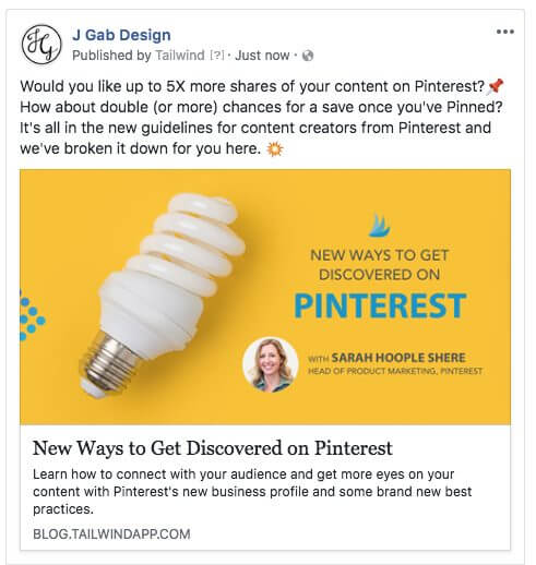 With this feature from Tailwind, you won't just be sharing a link to a Pin! Tailwind will look at the content you are sharing and pull out the best image for Facebook. You'll also have the option to add a Facebook description. This looks much better! π